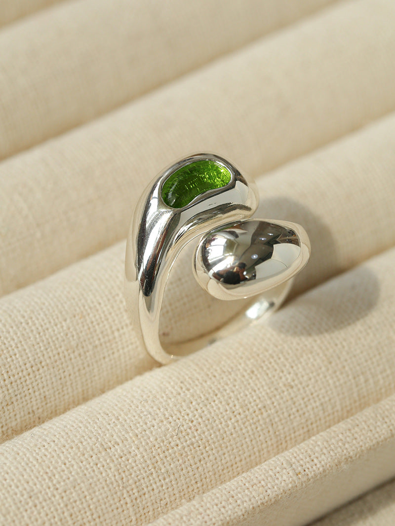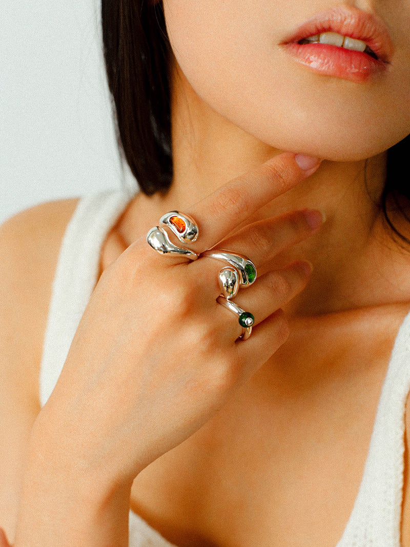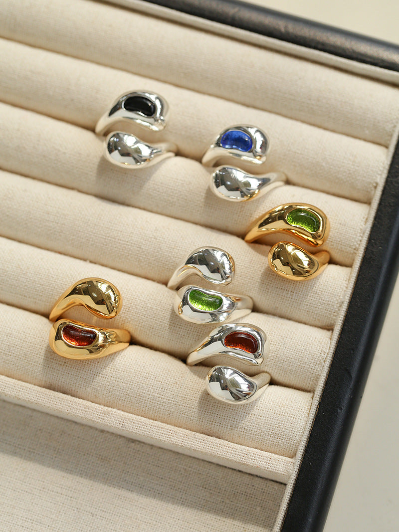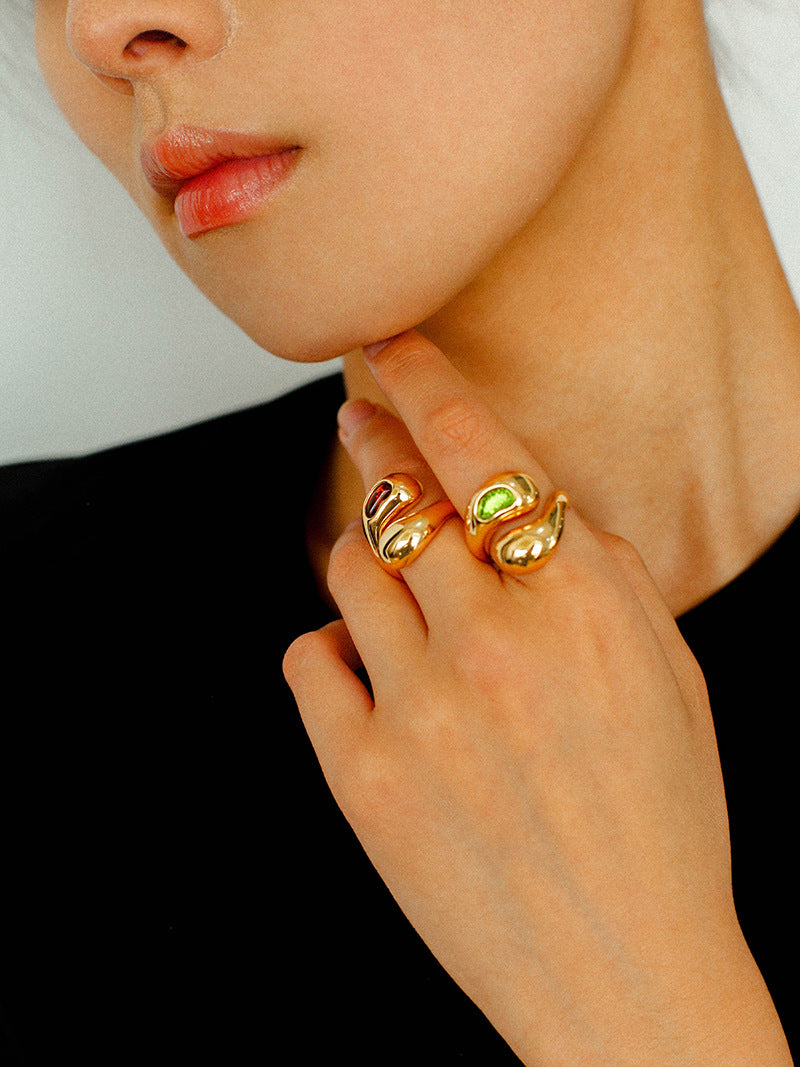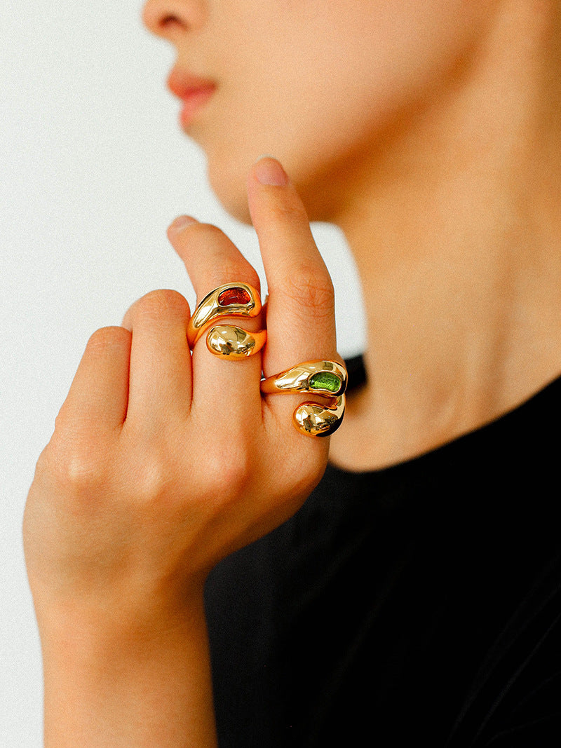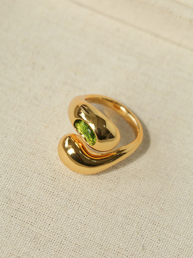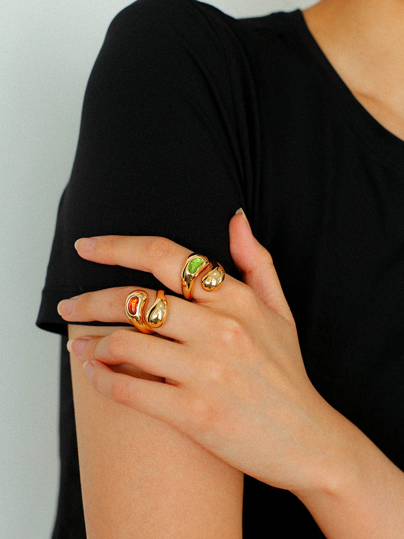 A playful harmony of contrast and curves, the Peapod Duo Ring features a crossover open band with dual-color glass bead inlays resembling abstract peapods. Crafted from brass and finished in 18K gold and platinum plating, this sculptural ring brings together fluid form and unexpected color for a modern, eye-catching look.