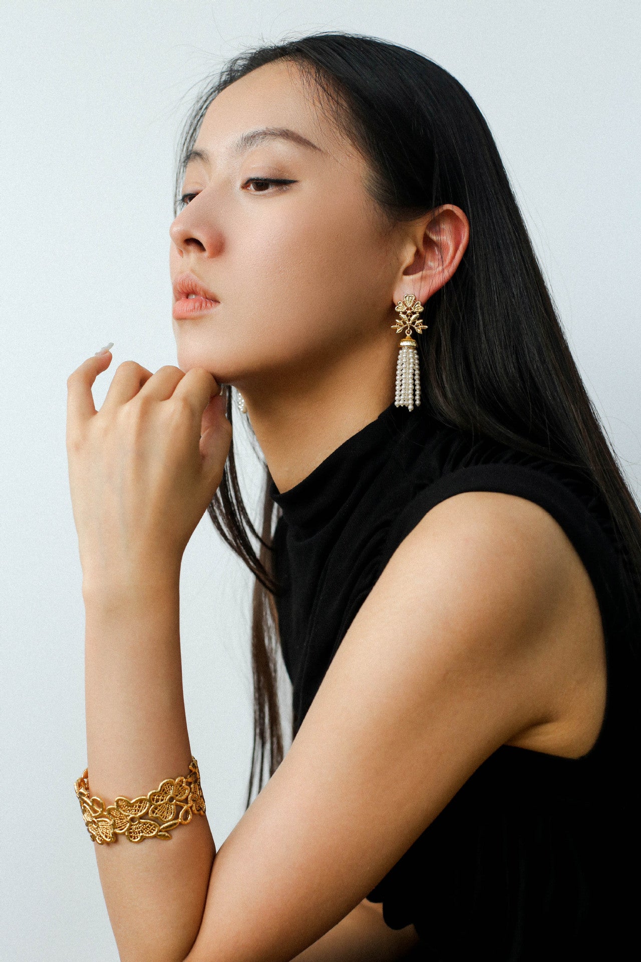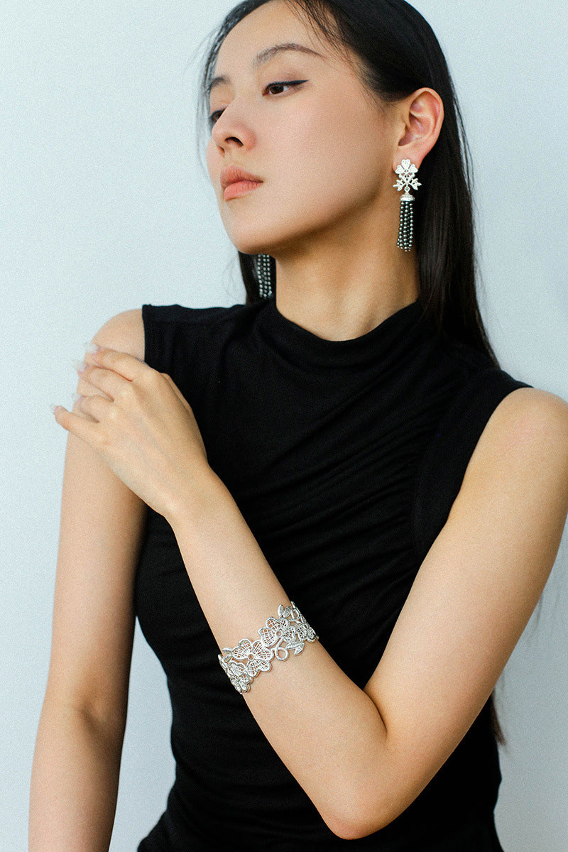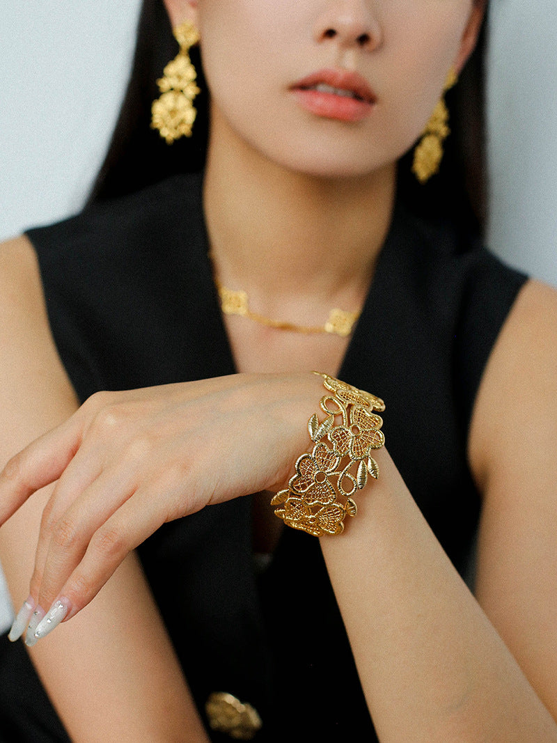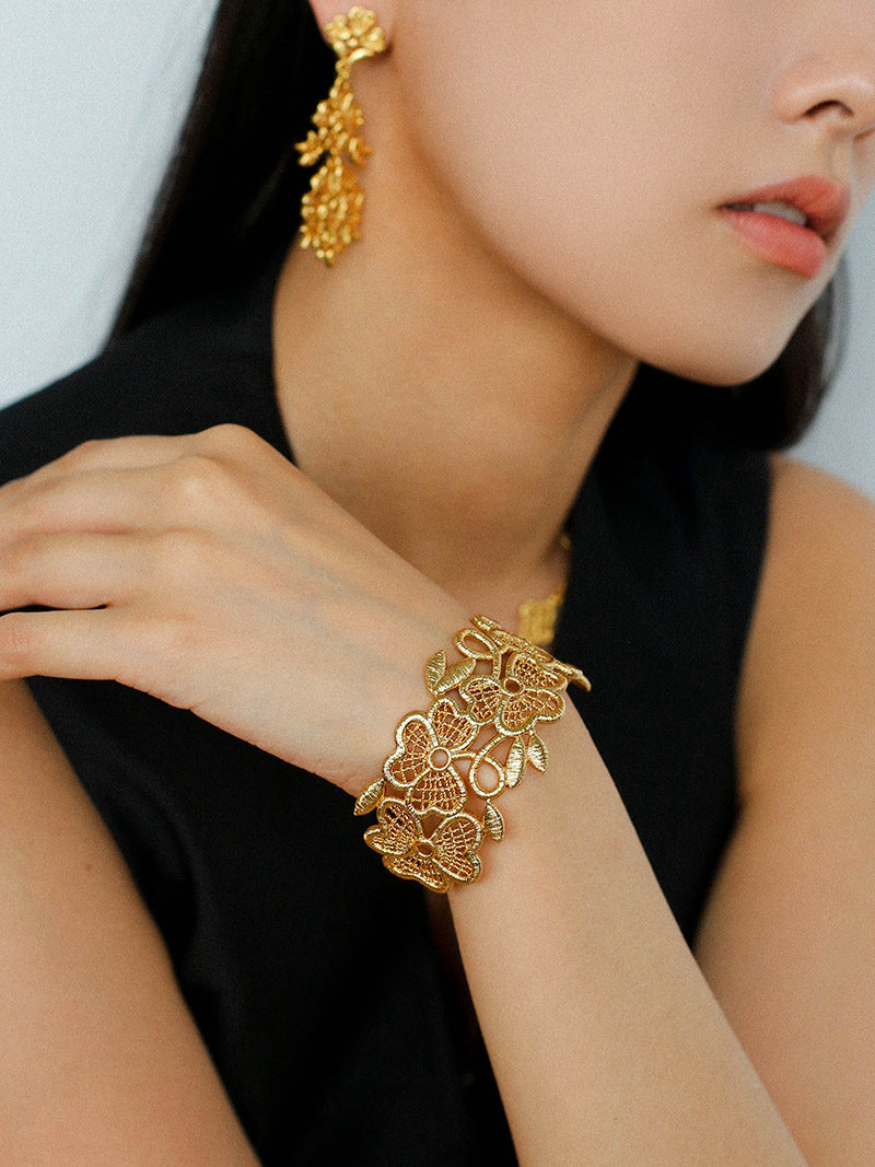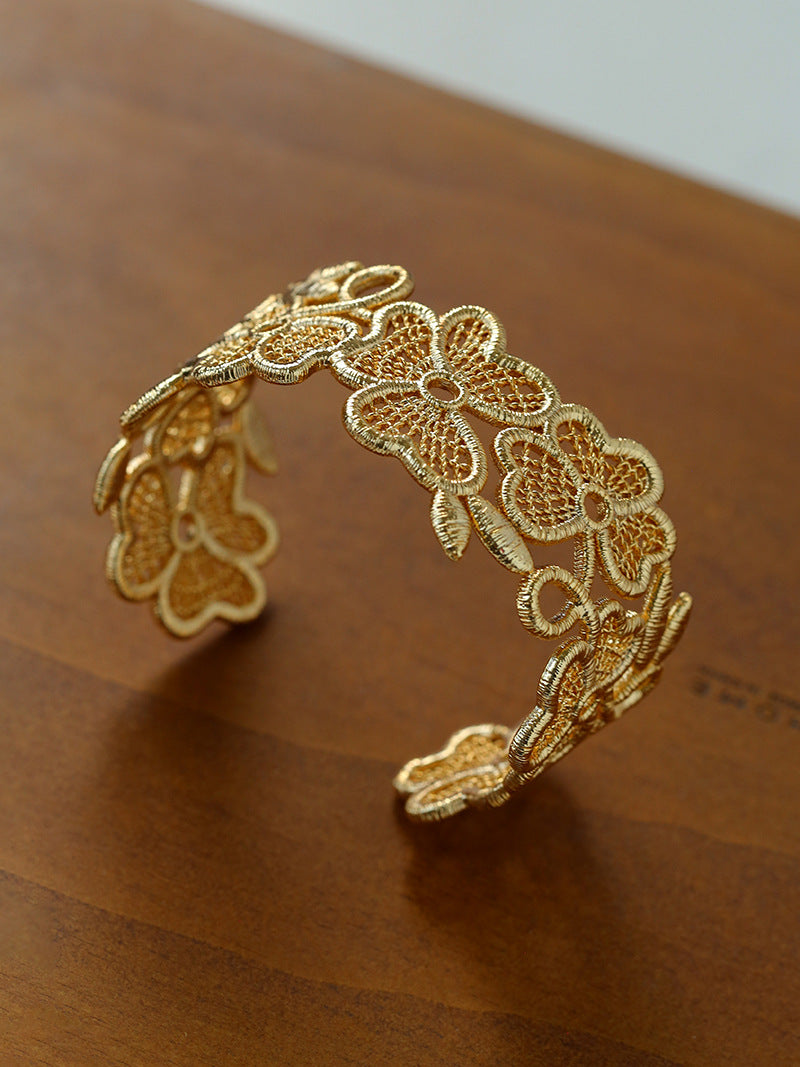 Inspired by the delicacy of lace and the charm of blooming florals, this open cuff bracelet brings a graceful and romantic touch to your jewelry collection. Crafted from brass and plated in 18K gold or silver, it features intricate hollow-out flower motifs that wrap gently around your wrist. Whether worn solo or layered, it makes a refined statement with any look.
