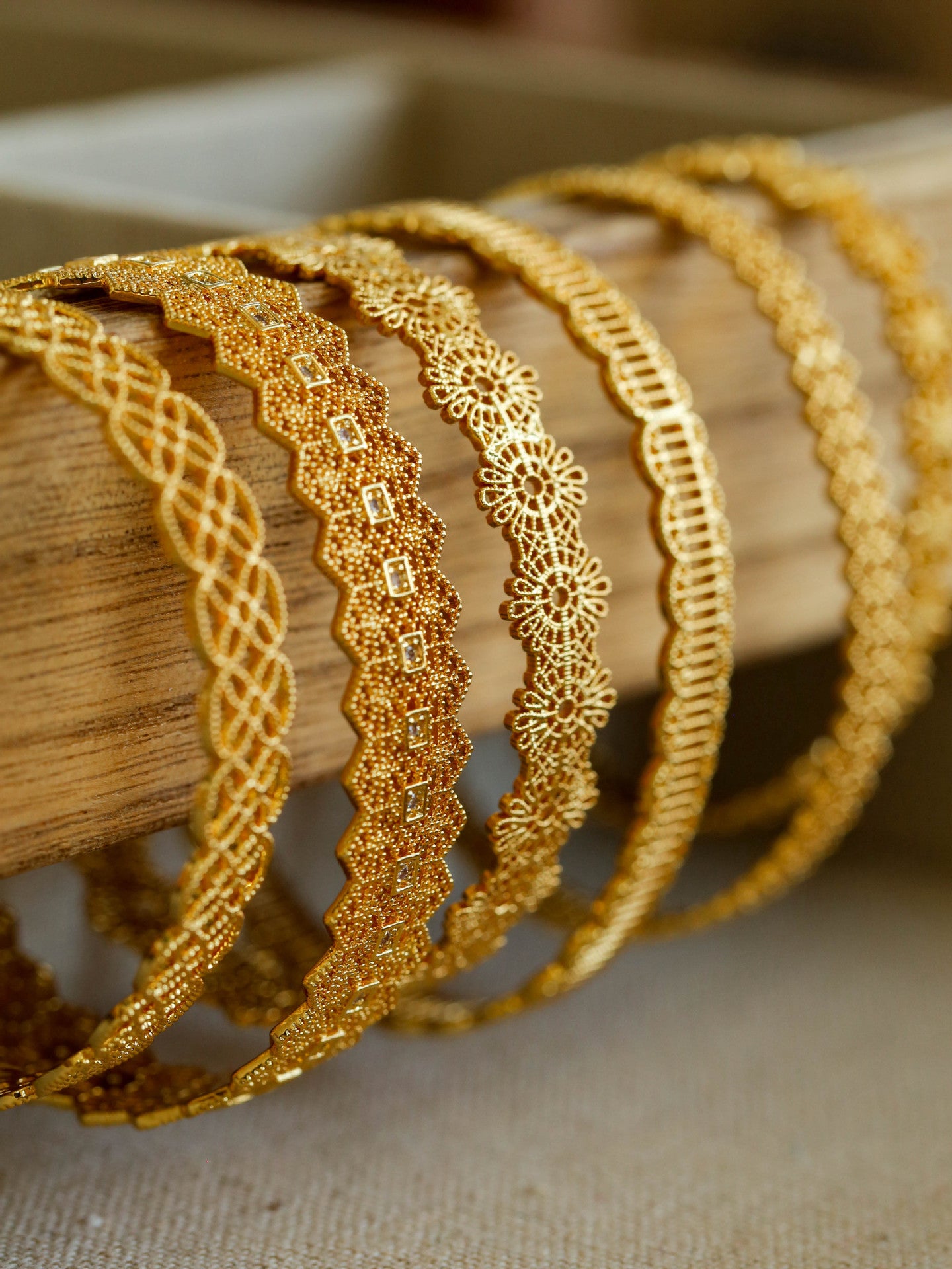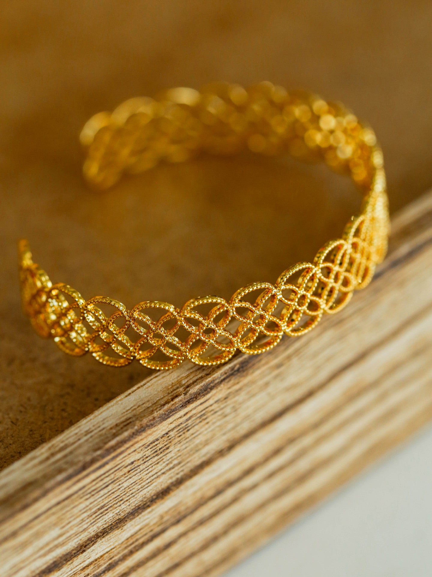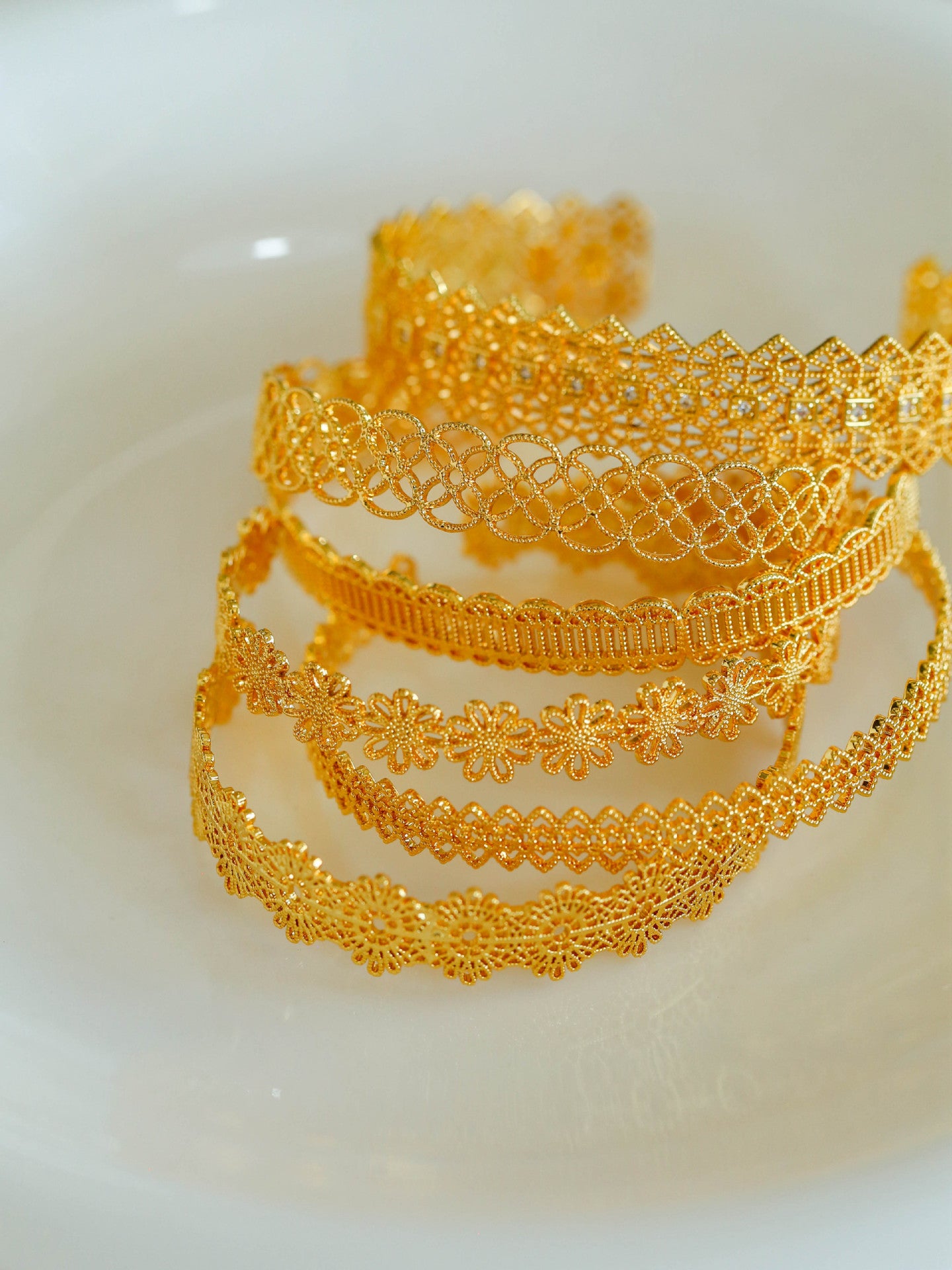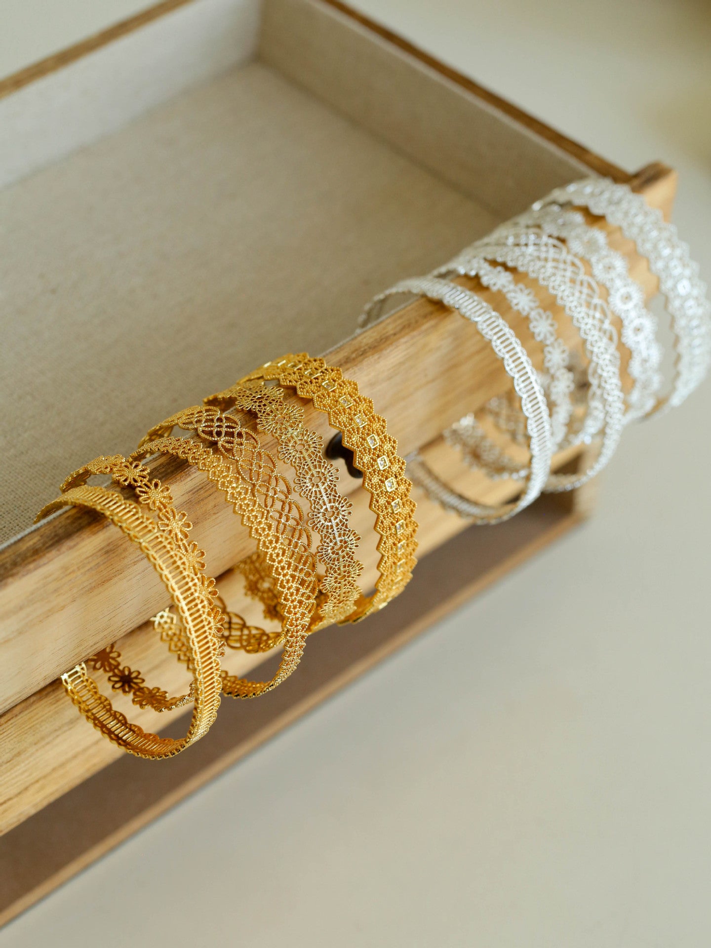 Delicate yet statement-making, the Lace Whisper Cuff Collection reimagines timeless lacework in gleaming metal form. This series of six openwork designs is inspired by vintage embroidery, offering intricate patterns in both gold and silver tones. Each cuff is open-ended for effortless adjustability and comfort.